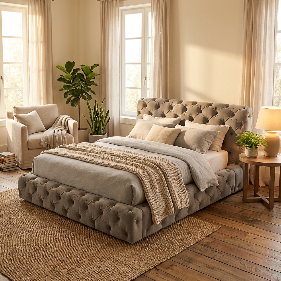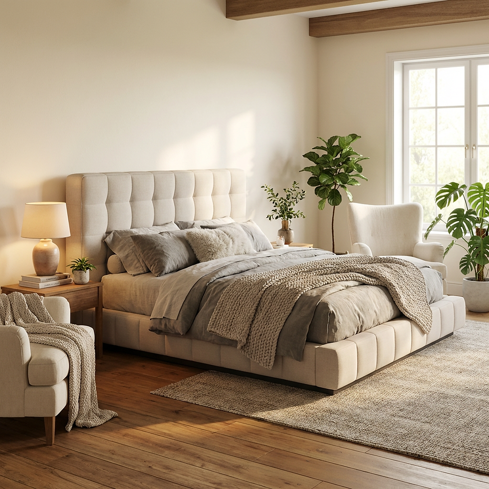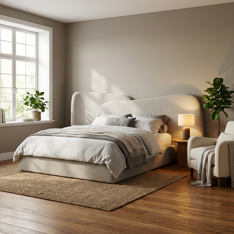 Apportez élégance et confort à votre chambre avec le lit Morelo. Son design moderne aux lignes épurées et sa tête de lit arrondie généreusement rembourrée créent une ambiance raffinée et chaleureuse. Revêtu d’un tissu beige intemporel, il s’intègre facilement à tout style de décoration, qu’elle soit contemporaine, minimaliste ou classique.